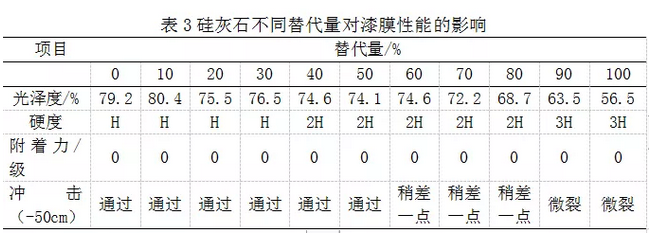 從生產過程來看,由于硅灰石的密度為2.7,硫酸鋇的密度一般在4.3左右,所以硫酸鋇的下料速度會優于硅灰石,且從加工性能上來看,硫酸鋇的流動性會更好一些。按表1所示配方,硅灰石的替代梯度為10%,分別從0%到100%對配方中的沉淀硫酸鋇進行替代,進行實驗,最終制得的聚酯粉末涂料的漆膜各項性能指標見表3。